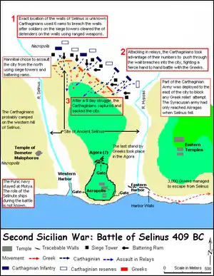 The Battle of Selinus, which took place early in 409 BC, is the opening battle of the so-called Second Sicilian War. The ten-day-long siege and battle was fought in Sicily between the Carthaginian forces under Hannibal Mago (a king of Carthage of the Magonid family, not the famous Hannibal of the Barcid family) and the Dorian Greeks of Selinus. The city of Selinus had defeated the Elymian city of Segesta in 415, an event that led to the Athenian invasion of Sicily in 415 and ended in the defeat of Athenian forces in 413. When Selinus again worsted Segesta in 411, Carthage, responding to the appeal of Segesta, had besieged and sacked Selinus after the Carthaginian offer of negotiations had been refused by the Greeks. This was the first step towards Hannibal's campaign to avenge the Carthaginian defeat at the first battle of Himera in 480. The city of Selinus was later rebuilt, but never regained her former status.