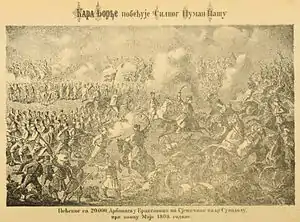 In the spring of 1809, during the Russo-Turkish War (1806–12),[2] the Serbs took up arms once again, and begun directing attacks on Serb-inhabited territories outwards of the former Sanjak of Smederevo.[2] Prior to the Battle of Suvodol, Karađorđe and his forces liberated Nova Varoš and Sjenica and moved onwards towards the river Lim. On 9 June and wary of Köprülüzade Numan Pasha’s forces that were already based in the Suvi Do area, Karađorđe’s forces moved onwards from the river Lim towards Suvi Do. [2] The next day on 10 June, Karađorđe’s forces arrived in Suvi Do from the North West. The exact number of soldiers that were deployed is difficult to attain, with some numbers ranging from 8000 to 20000 Albanian fighters under Köprülüzade Numan Pasha's command and between 4000 and 6000 Serbian fighters under Karađorđe’s command. However, a rough estimate puts Karađorđe’s forces at 4–4,500 troops and an unknown number of cannons. While Köprülüzade Numan Pasha's forces were numbered at 4,000 soldiers with no cannons.[1]