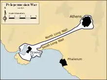Wanting to deny any future Persian invasion a base from which to operate, Sparta had urged Athens, along with other Greek cities, to refrain from rebuilding their walls. However, suspecting a Spartan ploy and having already begun the work of construction, Athens employed subterfuge to delay the wheels of diplomacy until she could finish them. In 458 BC, Athens began building the Long Walls, a defensive structure that secured the communication lines between the city and Piraeus.[6] Like other walls that were built, it allowed the Athenians to refuse battle and retreat without fear of being cut from supplies coming from the sea.[7]