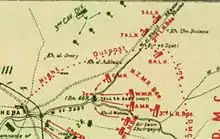 Four Ottoman divisions fought in the area: the 19th, 24th and 27th Divisions, and the 3rd Cavalry Division.[29][30] During the battle on 31 October, the Ottoman III Corps headquarters had retreated from Beersheba to Tel es Sheria but, the next day (1 November), moved to support the defence of the Jerusalem road from Edh Dhahriye. They were followed by the 143rd Regiment (24th Division) and 1,500 rifles of the Beersheba Group, which had been reorganised at Tel es Sheria. This latter group moved to defend Tel el Khuweilfe.[31] On 1 November, the 125th Regiment (16th Division) also moved west into the hills coming under the command of the 27th Division, while the 6th Cavalry Regiment covered the Ottoman left flank to Yutta.[32] Kress von Kressenstein also sent the 19th Division to reinforce the Seventh Army in the area.[29] This strong Ottoman presence defending the area was designed to encourage Allenby to commit more units to the attack, to take the pressure off the Ottoman forces defending Gaza and Sharia, and to lessen the possibility of an EEF breakthrough.[33][Note 3]