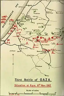 The 159th Brigade on the left was ordered to advance on Ain Kohle, but could not move forward. Several urgent requests were made during the day for a mobile reserve of a brigade or a regiment, but they were denied by Chauvel, who could not spare the reinforcements.[124] Although the attack by the 53rd (Welsh) Division had been very confused, suffering a "bloody defeat" instead of a "conquest", the 19th Division was stopped from moving back to reinforce Tel esh Sheria. The continuing threat of an attack up the road to the headquarters of the Seventh Army at Hebron and on to Jerusalem, was maintained by the repeated attacks on Tel el Khuweilfe by the 53rd (Welsh) Division.[125] By the end of the day, the Ottoman defenders had succeeded in defeating the British infantry attacks on Tel el Khuweilfe, and continued to hold Tel esh Sheria, but they had begun to evacuate Gaza.[126] At nightfall, Chauvel issued orders for the Anzac and Australian Mounted Divisions to begin their advance northwards via Sheria towards Jemmameh and Huj, while Barrow commanding the Yeomanry Mounted Division was to take command of the force at Tel el Khuweilfe, including the 53rd (Welsh) Division.[112]