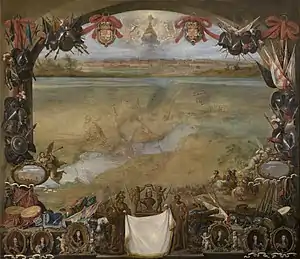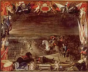 The Battle of Valenciennes became the subject of several paintings by renowed Flemish artists like David Teniers II and Pieter Snayers. Teniers, who was the court painter at Brussels, depicted the relief in a canvas using all the topographical, allegorical and rhetorical means of the Baroque imagery.[53] The commanders of the army, including John Joseph, the Prince of Condé and the Marquis of Caracena, were portrayed along a bust of Philip IV. In the painting, John Joseph appears in horseback, performing a levade, a position which makes reference to the his leadership abilities.[54] Snayers, a celebrated battle artist, was commissioned to depict the battle in a large canvas. It was owned by the Count of Peñaranda, who had led the Spanish delegation at the Peace of Münster, and, on his death on 1676, it was acquired by Ferdinand Bonaventura von Harrach, Imperial ambassador at the Spanish court.[55] The painting was much celebrated, and the rederijker Cornelis de Bie devoted more space to it in his work Het Gulden Cabinet (1662), a collection of biographical sketches of Flemish and Dutch painters, than to any other painting.[56]