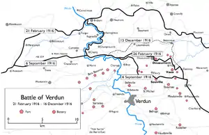 By the end of May French casualties at Verdun had risen to c. 185,000 and in June German losses had reached c. 200,000 men.[67] The opening of the Battle of the Somme on 1 July, forced the Germans to withdraw some of their artillery from Verdun, which was the first strategic success of the Anglo-French offensive.[68]