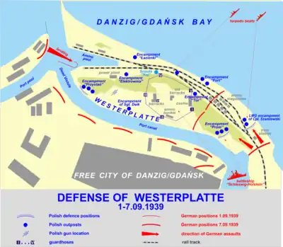 The Polish defense, which anticipated principally a German land-based assault, rested on three lines of defense. The outer line included entrenched outposts (codenamed Prom, Przystań, Łazienki and Wał) which were to hold long enough for the garrison to mobilize. The second line of defense centered on five guardhouses (numbered I to V) in the center of the depot. The final defense comprised the headquarters and barracks at the depot's center (sometimes referred to as Guardhouse VI). In addition, Poles also had several supporting positions (Elektrownia, Deika, Fort, Tor kolejowy and Kej).[6]: 445–446 The plan called for the garrison to hold out for 12 hours, after which the siege was expected to be lifted by reinforcements arriving from the mainland.[16]