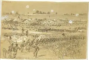 After weeks of preparation, on July 30 Union forces exploded a mine in Major General Ambrose E. Burnside's IX Corps sector, blowing a gap in the Confederate defenses of Petersburg, Virginia. From that propitious beginning, the situation deteriorated rapidly for the Union attackers as unit after unit charged into and around the crater, where the unprepared soldiers milled around in confusion. Grant considered this failed assault as "the saddest affair I have witnessed in this war."[4]