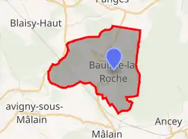 Baulme-la-Roche is located some 17 km west by north-west of Dijon and 8 km north-east of Sombernon. Access to the commune is by the D104C from Mâlain in the south which passes through the commune and the village and continues north-east to join the D10 south-east of Panges. The Paris–Marseille railway passes through the commune and the entrance to the Blaisy-Bas Tunnel is in the commune. The nearest station is at Malain south of the commune. The commune is mostly farmland but there are extensive forests - especially in the east.[5][6]