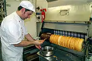 Traditionally, Baumkuchen is made on a spit by brushing on even layers of batter and then rotating the spit around a heat source. Each layer is allowed to brown before a new layer of batter is poured.[2] When the cake is removed and sliced, each layer is divided from the next by a golden line, resembling the growth rings on a crosscut tree. A typical Baumkuchen is made up of 15 to 20 layers of batter. However, the layering process for making Baumkuchen can continue until the cakes are quite large. Skilled pastry chefs have been known to create cakes with 25 layers and weighing over 100 pounds (45 kg).[2] When cooked on a spit, it is not uncommon for a finished Baumkuchen to be 3–4 feet (0.91–1.22 m) tall.[3]