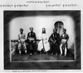 ![]() The earliest photographer of Udaipur, Madan Lal took this family portrait in the year AD 1888 of Maharaj Surat Singhji of Karjali (Center) with his four sons L-R, Kr. Tej Singh, followed by the eldest son Kr. Himmet Singh and second son Kr. Laxman Singh followed by young Bavji. |