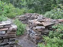 The ruins consist of walls outlining a small five-sided building and a 150-metre wall with ditches,[1][2] both made with flat-surfaced ironstone slate rocks on the slope of a hill overlooking the Bayers Lake Park. The mysterious ruins pose many unanswered questions for archaeologists.[3] The most simple and humble explanation suggests a sheep pen, but some envision a military purpose, either a training installation or a defensive work. The walls are a protected archaeological site designated under Nova Scotia's Special Places Act.[4][5][6][7][8][9] The site is included within the historic limits of one of the nine original Dutch Village grants issued in 1762 – a 150-acre grant assigned to Johann Gotlieb Shermuller. Schermuller sold the property in 1770 and moved to Philadelphia, where he became a butcher. The site changed hands many times after 1770. However, given its ground conditions, it is unlikely to ever have been farmed. The only structure on the property for which there is known documentary evidence is Feature 2. A 1918 map depicts a building standing in approximately the location of the site steps. (DMD 1918).[10]
