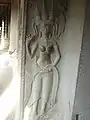 The inner gallery is raised above ground level and has doubled corners, with the original redented cross-shape later filled out to a square. Its bas-reliefs, later additions of Jayavarman VIII, are in stark contrast to those of the outer: rather than set-piece battles and processions, the smaller canvases offered by the inner gallery are decorated for the most part with scenes from Hindu mythology. Some of the figures depicted are Siva, Vishnu, and Brahma, the members of the trimurti or threefold godhead of Hinduism, Apsaras or celestial dancers, Ravana and Garuda.[16] There is however no certainty as to what some of the panels depict, or as to their relationship with one another. One gallery just north of the eastern gopura, for example, shows two linked scenes which have been explained as the freeing of a goddess from inside a mountain, or as an act of iconoclasm by Cham invaders.[17] Another series of panels shows a king fighting a gigantic serpent with his bare hands, then having his hands examined by women, and finally lying ill in bed; these images have been connected with the legend of the Leper King, who contracted leprosy from the venom of a serpent with whom he had done battle.[18] Less obscure are depictions of the construction of a Vishnuite temple (south of the western gopura) and the Churning of the Sea of Milk (north of the western gopura).