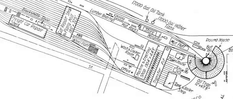 Other shops in 1921 included the Locomotive Paint Shop; the Planing Mill and Car Repair building, another large shop with a footprint of 185 by 335.5 feet (56.4 m × 102.3 m); and the Freight Car Repair Shed, 117 by 441 feet (36 m × 134 m).[7]