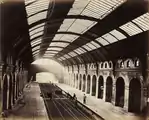 The platforms of Bayswater station were constructed in the trench and provided with a glazed roof. A short section of the trench was left unroofed to the west of the station to allow smoke and steam from the trains to escape from the tunnels. Even before the completion in 1884 of the continuous circuit of tracks which are now the Circle line, the MR and DR operated services through Bayswater as the Inner Circle.[11] The MR originally provided all of the trains, but from 1871, each company operated half of the service.[14]