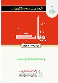 Bayyināt (Urdu: بینات, lit. 'Clear Proofs') is the monthly journal of Jamia Uloom-ul-Islamia. Its Arabic version is also published under the title of Al-Bayyinat. Its came into print in November 1962. Its the projection of Deobandi Ulama's religious authority in Pakistan. Apart from glorifying the ulama of its parent madrasah, It has published articles against Shias and Qadyanis on the one hand and against mainstream customs, education and politics of Pakistan on the other.[1][2]