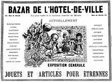 According to the legend, in 1855, Ruel saved Napoleon III's wife, Empress Eugénie, whose horses became frightened while passing in front of his store.[3] To reward him, she gave him a sum of money which, enabled him to expand his store, in 1856, which he renamed “Bazar Napoléon” to show his gratitude to the Emperor and his wife.[2] In 1866, thanks to his successful business, he was able to rent three floors of this same building, on 54 rue de Rivoli.[4] In 1870, his store occupied the whole building. In 1871, due to the fall of the Empire, Ruel changed the name of the store by “Bazar de l'Hôtel de Ville” which refers to the Hôtel de Ville, located across the street.[2]