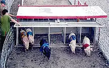 The pigs are provided by a local 4-H club,[4] and each pig can be purchased by a sponsor every racing season. The sponsor names the pig and a jersey made for it. Some past pigs names have been "Pumpkin Butt", "Raquel Belch", "Knuckles", "Pig O'War", "Ursowla Hamdress", and "Notta Hot Dog".[4] After the racing season is over, the pig is slaughtered and the sponsor has the option of donating the meat to charity or to keep it themselves. Pig Sponsors also can purchase billboard space around the racetrack, adding to the "stadium" effect. Some sponsors in the past have been the Riverboat Casino in Billings, Montana, the U.S. Bank in Red Lodge, Shipton's Big R ranch supplies in Billings, and Maxwell's restaurant in Cody, Wyoming.[4] The Carbon County Health Department and the U.S. Department of Agriculture oversee the health and condition of the pigs.[4]