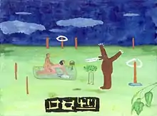 Bear Surprise (often dubbed just Surprise!) is a watercolor painting by American painter/musician John Lurie, the style of which has been described as primitivist and naïve.[1] The painting depicts a couple having sex in a meadow, with a bear standing in front of them, with forepaws in a distinctive position. There is a speech bubble beside the head of the bear, which reads "Surprise!".