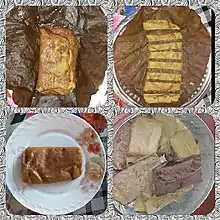 A few traditional dishes very popular amongst all the Tulu communities have unique names in Beary dialect. Pindi/pinde, basale-pinde, kunhi-pinde, erchiro-pinde, bisaliyappa (bisali beetiye appa/kaltappa), tondaredo-appa (syame), guliyappa, muttere-appa, neiyappa/nei-appa, chekkero-appa, manhel elero appa, acchi-appa, daliyappa, baale-appa, pondatte-appa, sank-roli, pattir (a distorted version of Arabic fatirah), nei pattir, pole, poo-pole (thanni-pole), pulcho-pole, vodu-pole, uppu-molavu, kanhi, methero-kanhi, nei-kanhi, kulte kanhi, manni, nombure kanchi, pirni are to name a few.[34][35][36]