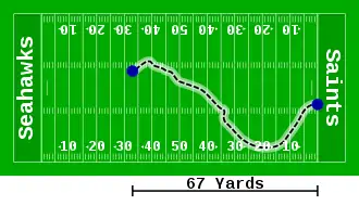 With their base offense on the field, the Seahawks called "17 Power", a power run, for the first time in the game.[2] Seattle lined up in an I formation with tight end Carlson on the left and fullback Michael Robinson offset to the left. New Orleans lined up in a 2–5 "under" front with strong safety Roman Harper crowding the line of scrimmage, putting eight defenders near the box.[3] Hasselbeck motioned wide receiver Ben Obomanu from the right to the left. At the snap, Seattle right guard Mike Gibson also pulled to the left.