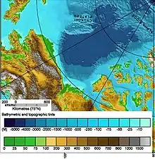 Canada maintains that this treaty is extensible from the land into the Beaufort Sea along the meridian. The United States rejects this extension and instead asserts a boundary line based upon equidistance, although its position is somewhat undermined by its acceptance in 1867 of similar treaty wording and a similar interpretation under the treaty whereby it acquired Alaska.[16] Both the U.S. and Canada agree that they are bound by the 1958 Convention on the Continental Shelf; and they both agree that the boundary should be "equitable", as determined by the International Court of Justice. They differ on what should be deemed "equitable". The U.S. contends that "equidistance is an appropriate principle for determining a maritime boundary where there are no special circumstances in the area and when equidistance results in a boundary in accordance with equitable principles". Canada contends that an equidistance principle does not result in an equitable boundary, because distortion would occur. The coast of Yukon is concave, whereas the coast of Alaska is convex; and thus an equidistance principle would result in a significant extension of the U.S. possession.[19] This dispute has taken on increased significance due to the possible presence of natural reserves within the wedge,[16][20][21] which according to Canada's National Energy Board may contain 1,700,000,000 m3 (6.0×1010 cu ft) of gas, which would cover the national consumption for 20 years, and more than 1,000,000,000 m3 (3.5×1010 cu ft) of oil.[18] Because of this, Canada argues that "special circumstances" apply to this border, a position that the U.S. rejects.[19] This dispute is in this respect a mirror image of the dispute between the U.S. and Canada over the Gulf of Maine, where the U.S. argued for "special circumstances" and Canada argued for the equidistance principle.[19] (In that latter dispute, both of those arguments were rejected, and the border was drawn based upon geometric principles taking into account geographic factors.[19]) Neither the U.S. nor Canada has pressed for a swift resolution for the matter, or arbitration at the International Court of Justice, however;[16] and the two have in the meantime cooperated in several measures aimed at preserving the maritime environment.[16][19]