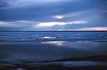The Beaufort Sea is frozen over through the year, except for August and September when the ice breaks near the coast and opens what was once a 50–100 km (31–62 mi) wide strip of open water.[2] During the 2000s, due to climate change in the Arctic, the ice-free area in late summer greatly enlarged. During the record minimum extent of Arctic sea ice in September, 2012, the sea ice boundary had retreated northward much farther than normal from the coast.[29][30][31][32]