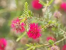 The flowers are purple or purplish red and are arranged in bottlebrush-like spikes on the ends of branches which continue to grow after flowering. The flowering part of the stem is densely hairy and the flowers have 5 sepals, 5 petals and 5 bundles of stamens. The stamen bundles, which give the flowers their colour contain 3 to 7 (usually 5) stamens which are joined for about half their length. Flowering occurs from October to December or in January to February and is followed by fruit which are woody capsules in clusters about 12 mm (0.47 in) long .[1][2][3]