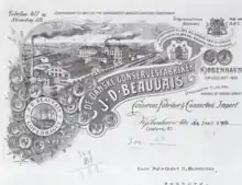 Beauvais was founded by and is named for Jean Baptiste Desiré Beauvais. He was born in Paris but came to Denmark with his family in 1846. The family was on the way to Russia but ended up settling in Copenhagen where his father opened a charcuterie store on Østergade. Jean Desiré Beauvais established a production of canned food on his father's estate in Vangede in 1850. The products were mainly sold to the Royal Danish Navy. The company relocated to Store Kongensgade in 1865 and was also engaged in the import and export of canned food. Beauvais passed the management of the company over to his two sons in 1885 and it was converted into a limited company (aktieselskab) after his death.[1]