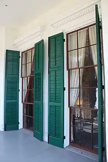 On the back, west wing of Beauvoir, behind a front-yard tree, the green storm shutters survived the floating debris that battered the entrance. The shutters protected the glass panes despite the 24-foot (8-m) storm surge that submerged the area. Whole sections of the Beauvoir home have remained intact to preserve many of the original construction details and windows (as seen in the photograph excerpts, at right).