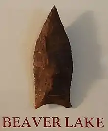 The Beaver Lake point is a projectile point of the Paleoindian period. Archaeologists have related this point to the Dalton Tradition and to the Simpson point. Beaver Lake points are lanceolate (leave-shaped), narrow, and side-notched. They are 4.1 to 5.1 cm long, 1.7 to 2.1 cm wide, and 0.4 to 0.5 cm thick. Beaver Lake points are found in the Ohio and Tennessee river valleys and to a lesser extend in adjacent areas and much of the Southeastern United States.