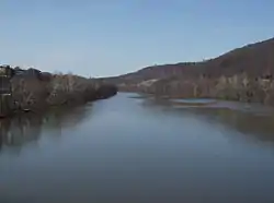The Beaver River is a tributary of the Ohio River in Western Pennsylvania in the United States with a length of approximately 21 mi (34 km). It flows through a historically important coal-producing region north of Pittsburgh. The Beaver River is formed in Lawrence County by the confluence of the Mahoning and Shenango rivers in the Mahoningtown neighborhood of New Castle.[4] It flows generally south, past West Pittsburg and Homewood. It receives Connoquenessing Creek west of Ellwood City and flows past Beaver Falls and New Brighton. It joins the Ohio at Bridgewater and Rochester (flowing between these two towns) at the downstream end of a sharp bend in the Ohio approximately 20 mi (32 km) northwest of (and downstream from) Pittsburgh. In the lower reaches near the Ohio River, the Beaver cuts through a gorge of underlying sandstone. The river is roughly parallel to the border with the state of Ohio, with both Interstate 376 and Pennsylvania Route 18 running parallel to the river itself.