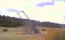 The beaverslide is constructed of a rigid pole frame in the form of a right-angle triangle that supports a steeply inclined, slatted, plank ramp, with or without sides, approximately 50–60 feet (15–18 m) long. The size and angle of individual beaverslides varies greatly and reflects local needs.[13] Beaverslides were originally of all-wooden construction, usually lodgepole pine,[8] and could last 10 to 15 years.[14] In the 1970s, some components began to be made of metal, which are longer-lasting.[15] The inclined ramp, about 15–20 feet (5–6 m) wide, is made of smooth wooden or metal slats and is about two thirds the length of the poles.[13] In the 1920s it became possible to extend the height of the slide so that the hay could be thrown further.[15] In the 1950s movable wings were placed on either side of the ramp so that the hay could be stacked more neatly.[15] A flat, toothed wooden platform called a "basket" or rack is suspended by a system of cables and pulleys from the poles.[16] It is raised to bring hay to the top of the slide, and then lowered back down along the length of the ramp. A backstop, usually an open wooden grid held up by poles, is set at the far end of the stack helps hold the completed stack in place.[15] A fence of wood panels or other materials is often placed around the stack to keep out livestock.[17]