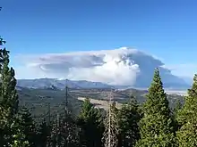 Houses and outbuildings in the immediate area were threatened, with fire crews implementing structure protection on July 3. By the next morning, July 4, the Sugar Fire had burned 470 acres (190 ha) and was 15 percent contained.[3] Evacuation warnings were put in place for the ranches along Maddalena Road.[13] That warning was rescinded on July 5 due to the fire's lack of growth.[14] In the late afternoon of July 6, the Sugar Fire jumped containment lines, fueled by gusty winds. Burning northeasterly, it grew 1,875 acres (759 ha). As a result, mandatory evacuations were put in place for residents in portions of Beckwourth. Evacuation warnings were put back in place for Dixie Valley and extended to Frenchman Cove. An evacuation center opened in Portola, California.[6] The next day, July 7, Frenchman Cove was placed under mandatory evacuation and Frenchman Lake was placed under an evacuation warning.[15][16] Due to the fire's increasing behavior due to dry, hot and windy conditions, more mandatory evacuation orders were put in place for Dooley, Big Cove, Frenchman Cove, Frenchman Village and Frenchman Lake including all campgrounds and residences around the lake and Maddalena.[7] The fire pushed towards Dixie Lookout in the north and began spotting around Frenchman Lake. The United States Forest Service closed forest access for the Beckwourth Complex area and shut down numerous roads that access the forest, including Highway 284, on July 9.[8] That same day, residents in the Doyle Grade area in Lassen County were evacuated.[17] The fire continued to expand towards the evacuated Doyle Grade area and eventually created a pyrocumulonimbus cloud, producing its own lightning. By the morning of July 10, the Sugar Fire had burned 16,365 acres (6,623 ha), moving further northeast. Additional evacuation centers were opened in Susanville, California and Reno, Nevada.[18] That day, the fire reached Highway 395 and closures were put in place.[19]