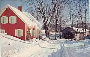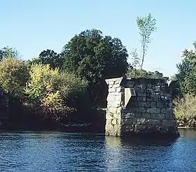 The Bedell Bridge was a Burr truss covered bridge that spanned the Connecticut River between Newbury, Vermont and Haverhill, New Hampshire. Until its most recent destruction in 1979, it was, with a total length of 382 feet (116 m), the second-longest covered bridge in the United States.[lower-alpha 1] The bridge was divided into two spans of roughly equal length, and rested on a central pier and shore abutments constructed from mortared rough stone. The eastern abutment has been shored up by the addition of a concrete footing. The bridge was 23 feet (7.0 m) wide, with a roadway width of 18.5 feet (5.6 m). Because the state line is the western low-water mark of the Connecticut River, most of the bridge was in New Hampshire; only the western abutment is in Vermont.[3]