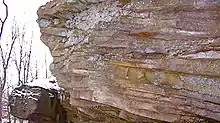 The ancient Ontario River probably entered the Ohio Bay about Lorain County,[80] depositing red sediment which originated in the eastern part of the Canadian Shield.[81][82] This created the Red Bedford Delta which deposited the sediment that became the red Bedford Shale of north-central and northeast Ohio.[23] In time, the Red Bedford Delta extended about 210 miles (340 km) south into the Ohio Bay,[78] nearly dividing it.[23] The pre-erosion delta was roughly 75 miles (121 km) wide at its northern end, 60 miles (97 km) wide in the middle, and about 20 miles (32 km) wide at its southern end. Two lobes, each about 5 to 6 miles (8.0 to 9.7 km) wide, extended from the southern tip.[78] Oscillation ripple marks in the siltstone of the Bedford Shale's gray basal part shows that this sediment was deposited under water.[83][lower-alpha 10] These ripple marks are not present in the red Bedford Shale, indicating it was deposited subaerially. There is also a well-documented system of about 100 miles (160 km) of ancient braided and meandering water channels in Ashland, Holmes, and Knox counties, indicating where the distributary network of the river sought to reach the sea.[84]
