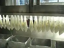 At the Beecher's facility, their process for cheese manufacturing is multi-staged. Thousands of gallons of milk are hose-fed from delivery trucks into the manufacturing area, where it is heated to complete the pasteurization of the milk.[14] The heated milk is processed into a stainless steel trough, and the temperature further increased, while the first live cheese cultures and rennet, a coagulant, are added to the developing mixture.[10][14] According to Amir Rosenblatt, a cheesemaker at Beecher's, the heating and cheese temperatures used in their cooking process are tightly controlled through the sustainable technology of steam power. "A variation of half a degree [in the pasteurization process] can change the flavor of the cheese," he said.[13] Cheesemakers use stainless steel "rakes" to then gather the milk mixture, before allowing it to settle briefly, at which point the cheese is cut repeatedly by hand until it achieves a yogurt-like texture and substance. This process is repeated often, until a desired consistency is reached.[14] The mixture is then drawn away to a new trough where most of the remaining water and whey is drained from the cheese.[10][14] While the whey is continually pulled from the cheese, cheesemakers constantly separate the cheese by hand into smaller and small stacks of cheese curds, which form as the whey is removed. To complete the curding, a large amount of salt is added to cure the cheese and draw still more whey from it.[10][14] The curds are finally cut into portions, filled into cheese molds, stacked on top of each other, and the remaining excess moisture is forced from the cheese with a constant 60 pounds (27 kg) of pressure for at least 24 hours, before the finished cheese is stored to age.[10][14] For every 10 pounds (10 kilograms) of milk and whey, Beecher's will typically create 1 pound (1 kilogram) of finished cheese.[10]