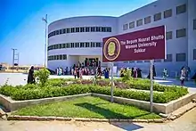 First ever public sector Women University in the Upper Sindh was established at Rohri,[2] in the name of Begum Nusrat Bhutto by the government of Sindh through the act of parliament.[3] Begum Nusrat Bhutto Women University ( بیگم نصرت بھثو ويمن يونيورسٹى) is located at the National Highway N-5 bypassing Rohri city of Sukkur District. It is exclusively for women, having the arts, science, business, and computer science faculties. Initially the departments of Education, English, mass communication, business, Mathematics and Biological and Human Sciences have started their teaching programs.[4] The construction work of the university is looked after by the project director appointed by Government of Sindh and is carried out by M/s Global Engineering Services Rawalpindi, Currently the construction work is at its full swing.[5]