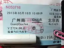 Train G66 only stop at stations of province capitals and is thus the fastest train service from Guangzhou to Beijing, with a travelling time of 8 hours. The train is also called as the "benchmark train" (Chinese: 标杆车).