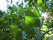 It can measure 30 m in height and one metre in diameter. The trunk is straight and branched, and the bark is gray with longitudinal fissures. Leaves are opposite and subopposite, elliptical to aovate-elliptical, and they have entire margins; they are glossy green above and glaucous below. The apex is rounded or slightly emarginated and the base is lightly wedge-shaped. The leaves are about 3-7.5 cm long and 2–4 cm wide, with pubescent petioles 2–5 mm long. The hermaphrodite flowers are arranged in inflorescences about 5–6 cm long. The pedicellate flowers are 4–6 mm and greenish-yellow in color.[1] The fruit is a green, globose drupe with a single seed, 1.5–2 cm in diameter, with a point at the apex.