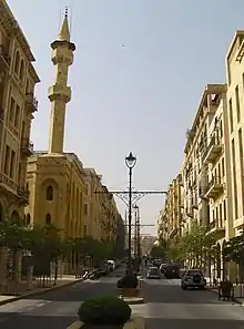 Synonymous with Lebanon's modern history, Martyrs' Square is a central, and biggest, town square in Beirut and its central district.[40] Initially named "Place des Canons", or "Cannons Square", it was built by the Ottomans during their occupation of Lebanon in the 19th century. During World War I, Beirut suffered from a blockade by the Allies which was intended to starve the Turks out; however, the result was a famine that killed a quarter of Lebanon's population. An unsuccessful revolt against the Turks broke out which resulted in the execution of Lebanese nationalists in the square on 19 May 1916, hence bestowing upon it its current name, "Martyrs' Square". The Square was completely destroyed in the Lebanese Civil War, and reconstruction began in the early 1990s. The "Martyrs' Statue", the iconic bullet-riddled centerpiece of the square, was maintained and restored alongside the old opera house.[41] After the assassination of Prime Minister Rafik Hariri, the square regained its original role as the "throbbing heart of the political life in Lebanon".[42] The Square became ground zero for the political sit-ins, demonstrations, and protests of the Cedar Revolution in 2005. Solidere recently commissioned the re-designing and landscaping of the square, after an international urban design competition for the Martyrs' Square axis was conducted by an international organization.[43]