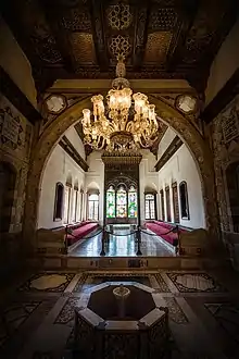 The entrance to the central section of the palace, Dar El Wousta, is from a double stairway at the far western end of the courtyard. From this point on, the impressive but austere appearance of the outside court and buildings gives way to the delightful architecture featuring beautiful arcades, mandaloun balconies, fountains, facades, rooms with carved and painted cedar wood embellished with Arab calligraphy, antique furniture, inlaid marble and fine mosaics.[2] These rooms served as offices and receptions salons.