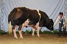 The Belgian Blue (French: 'Blanc-Bleu Belge', Dutch: 'Belgisch Witblauw') is a breed of beef cattle from Belgium.[1] It may also be known as the Race de la Moyenne et Haute Belgique,[2]: 95 or dikbil (literally 'fat buttocks' in Dutch). Alternative names for this breed include Belgian Blue-White; Belgian White and Blue Pied; Belgian White Blue; Blue; and Blue Belgian.[3] The Belgian Blue's extremely lean, hyper-sculpted, ultra-muscular physique is termed "double-muscling". The double-muscling phenotype is a heritable condition resulting in an increased number of muscle fibers (hyperplasia), instead of the (normal) enlargement of individual muscle fibers (hypertrophy).[4]