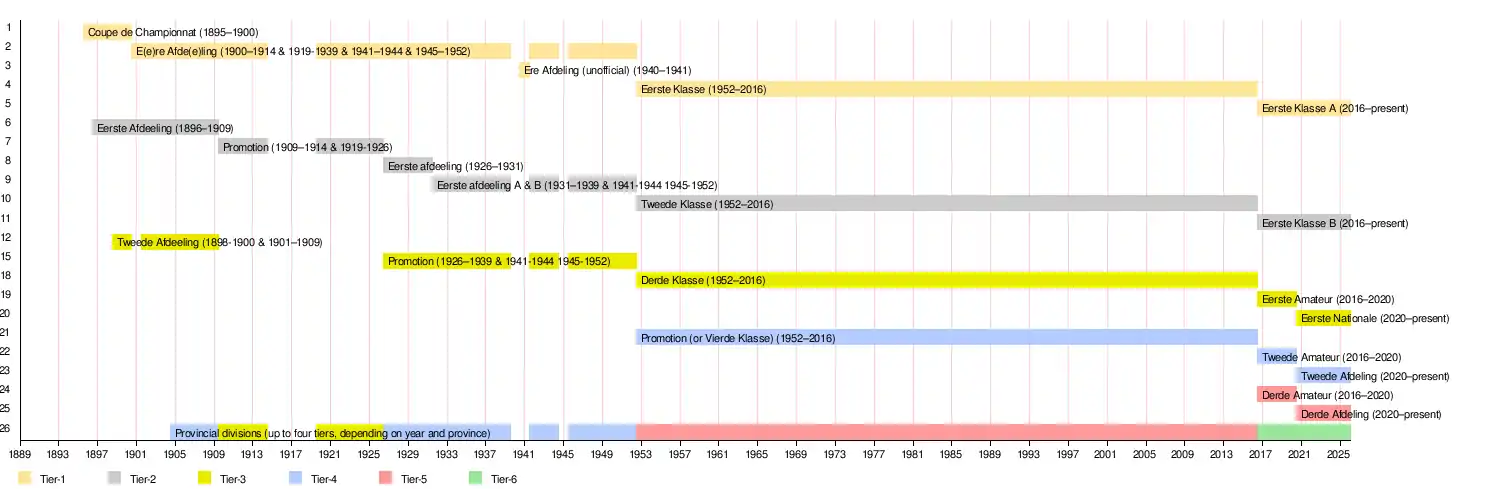 The timeline below lists the evolution of the men's tiers and leagues related to the Belgian FA since 1895. The provincial leagues often span multiple tiers depending on the province.