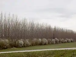 The belt between the inner and outer embankments, and the river, is planted with the forest trees. The forest acts as an obstacle for the high waters and strong winds, protecting this way the inland settlements (Borča, Kovilovo, Padinska Skela). It forms a sanitary and hygienic belt between the river and the human habitats, while the oxygen production is beneficial even for the settlements across the Danube. The most abundant tree species is the poplar. Poplars have been systematically planted and constantly re-planted as after 20 to 25 years they are being cut for the industrial production. The poplar is known for its fast growth and almost sponge-like absorption qualities, but the water is also absorbed by the humus layer which developed in time on the forest floor.[7] The natural forests are typical gallery forests, consisting of willows and poplars. The cultivated trees are hybridized Canadian poplar.[3]