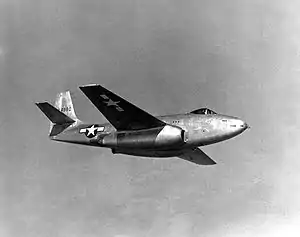 Early wind tunnel reports had pinpointed directional instability but the "fix" of a larger tail would not be ready in time for flight testing.[1] The first prototype was flown on 25 February 1945, by Bell's chief test pilot, Jack Woolams, who found it to be under-powered and unstable. The limited flight testing provided satisfactory flight characteristics although spins were restricted until the larger tail fin was installed. The second prototype did incorporate the extended tail and an aileron boost system.[2] One unique characteristic was the XP-83's refusal to slow down due to its sleek aerodynamic shape and lack of drag brakes. This meant that test pilots were forced to fly "stabilized approaches" (i.e. very long and flat landing approaches).[3]