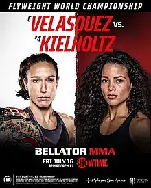 Undefeated Juliana Velasquez made her first title defense of the Bellator MMA Women's Flyweight World Championship against top-tier kickboxer Denise Kielholtz. The Brazil native has won all six of her fights in Bellator, including three by finish. Velasquez, 34, has a background in judo. Ranked #4 Kielholtz (6-2) is the Bellator Kickboxing Women's Flyweight Championship and has won four straight in MMA. She is 6-1 under the Bellator MMA banner.[1][2][3][4]
