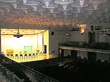 The building was obtained by the university in a lease-purchase agreement in 1984 and reverted to the full university ownership ten years later.[10] Today, Bellefield Hall is a 110,000-square-foot (10,000 m2) facility that is home to a variety of University offices and services. For the University's Department of Music, it houses rehearsal spaces, classrooms, graduate student offices, and the William R. Robinson Digital Recording Studio. A recently renovated 676-seat auditorium holds many of the Department of Music's recitals and concerts.[11][12][13] Bellefield Hall also houses a sports gym, fitness center, and indoor swimming pool.[12] The second floor fitness center was renovated and expanded in 2005.[14][15] A classroom specifically designed for African-drumming music was constructed in 2008.[16] Bellefield Hall is also home to the Collegiate YMCA at the University of Pittsburgh.[17]