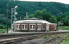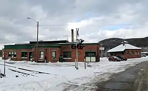 On December 21, 1921, much of the station was destroyed by a fire that began in the station's kitchen.[8] It was replaced in 1922-23 with a one-story brick building on the same site. Construction was handled by H. Wales Lines of Meriden, Connecticut.[9] The rectangular building has three polygonal pavilions - one each on the sides facing the tracks, and a larger seven-sided one facing the junction - to provide additional interior space. The larger pavilion, with its panoramic view of the Connecticut River, housed a newsstand and restaurant; the pavilion facing the CV/B&M line houses the agent's office.[2][7] A canopy wrapped around the station building and onto the REA building.[7] The new building opened on March 10, 1923.[10][note 1] The Great Vermont Flood of 1927 left the station under 4 feet (1.2 m) of water.[2]