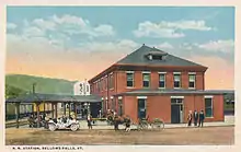 The Vermont Valley Railroad opened from Bellows Falls (including a tunnel under the town square) to Brattleboro, Vermont in 1851.[2][3]: 170 This placed Bellows Falls at the junction of two major trunk lines: Boston–Burlington via Rutland and Fitchburg, and New York–Montreal via New Haven and White River Junction.[2] Boston–Montreal traffic also passed through Bellows Falls until around 1853, when the Vermont Central began using the Northern Railroad as its main Boston connection.[3]: 249 [5]: 271 The railroads constructed a two-story brick station in the southeast corner of the railroad junction on the island.[2] The island also housed freight houses, a roundhouse, and other railroad structures.[2][6] A one-story brick Railway Express Agency (REA) building with a cupola on its roof was built next to the station between 1878 and 1885.[7]