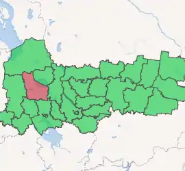 Belozersky District (Russian: Белозе́рский райо́н) is an administrative[1] and municipal[7] district (raion), one of the twenty-six in Vologda Oblast, Russia. It is located in the northwest of the oblast and borders with Vytegorsky District in the north, Vashkinsky District in the northeast, Kirillovsky District in the southeast, Cherepovetsky and Kaduysky Districts in the south, and with Babayevsky District in the west. The area of the district is 5,400 square kilometers (2,100 sq mi).[4] Its administrative center is the town of Belozersk.[3] Population: 17,271 (2010 Census);[5] 21,648 (2002 Census);[9] 24,777 (1989 Census).[10] The population of Belozersk accounts for 55.7% of the district's total population.[5]