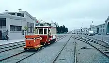 Belt Railroad tracks passing the Engine House in 1987, during a streetcar demonstration service that used the freight tracks for a short time