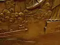 Harms also sculpts in wood, stone, or clay. In 2000, Gonzalez and Harms created four large bronze panels to be placed in the entrance lobby for the newly created liner, RMS Queen Mary II. Each panel depicted a different scene from around the world, including Africa, Europe, South America and North America. During the sculpting of the North American panel, Harms depicted the statue of liberty with a small satellite dish standing at the bottom. Beside the satellite dish is depicted Homer Simpson who has run a wire from the satellite dish into his TV in an attempt to obtain free cable.[2]